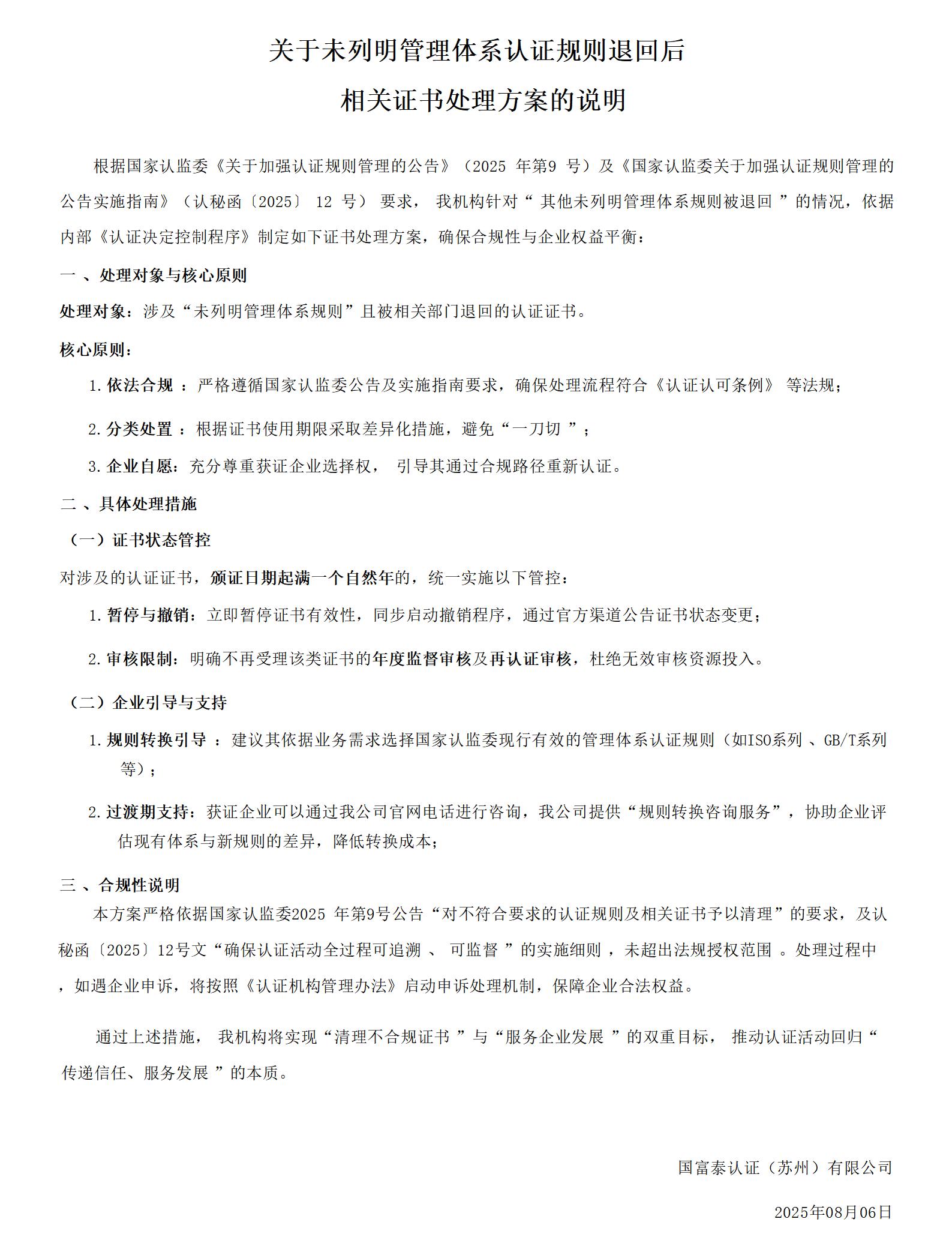 国富泰-关于未列明管理体系认证规则退回后相关证书处理方案的说明